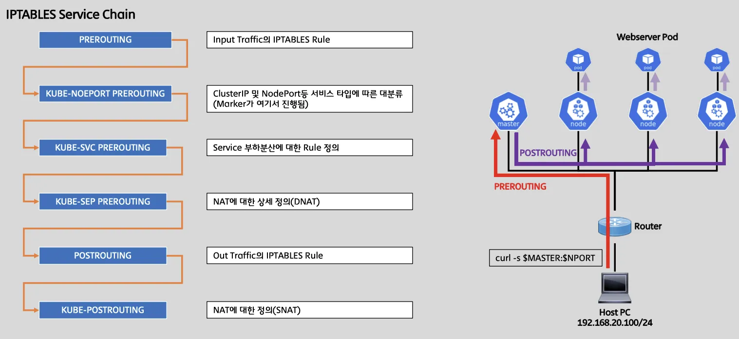 ClusterIP 의 iptables 와 다른 점은 KUBE-NODEPORT, KUBE-MARK-MASQ, POSTROUTING 이 추가된 것입니다.