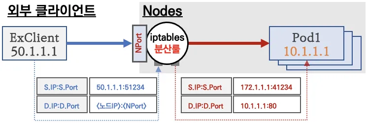 해당 노드의 iptables 규칙에 의해 SNAT/DNAT 되어 목적지 파드와 통신 후 리턴 트래픽은 최초 인입 노드를 경유하여 외부로 되돌아갑니다.