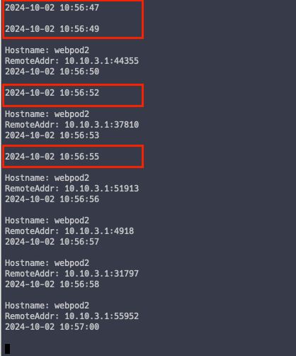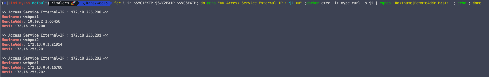 for i in $SVC1EXIP $SVC2EXIP $SVC3EXIP; do echo ">> Access Service External-IP : $i <<" ;docker exec -it mypc curl -s $i | egrep 'Hostname|RemoteAddr|Host:' ; echo ; done