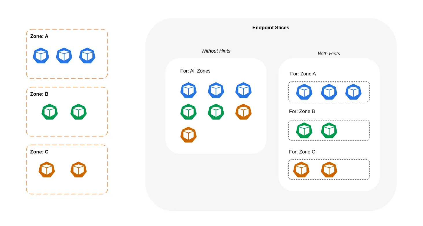 # endpointslices 확인 시, 기존에 없던 hints 가 추가되어 있음 >> 참고로 describe로는 hints 정보가 출력되지 않음