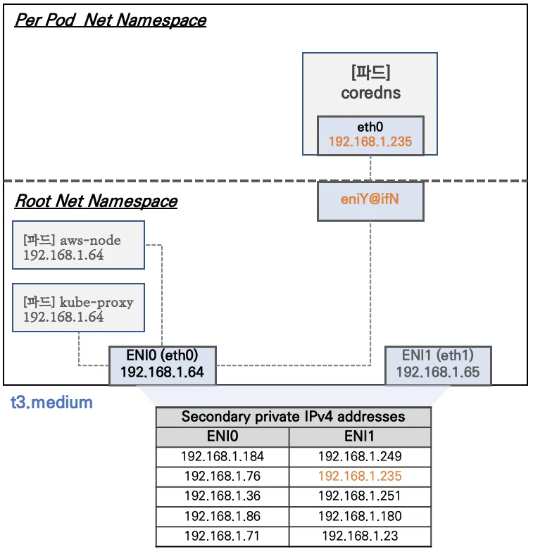 AWS 콘솔에서 노드 네트워크를 확인하면 보조 IP 를 가지고 있는 것을 알 수 있습니다.
