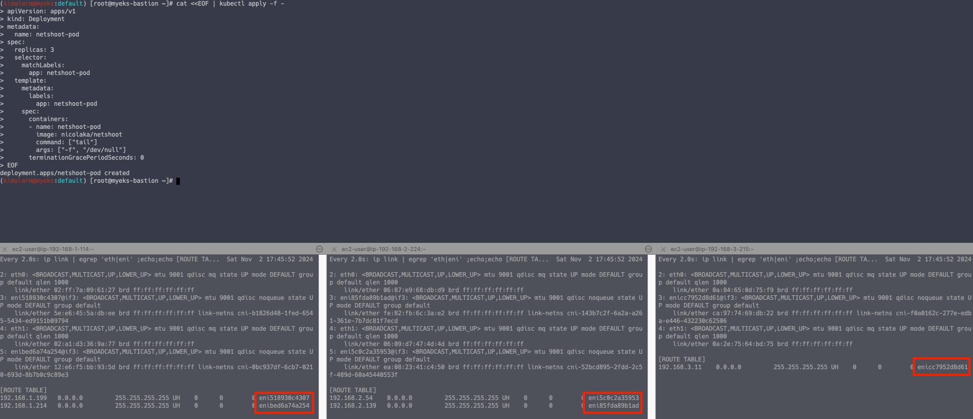 watch -d "ip link | egrep 'eth|eni' ;echo;echo "[ROUTE TABLE]"; route -n | grep eni"
