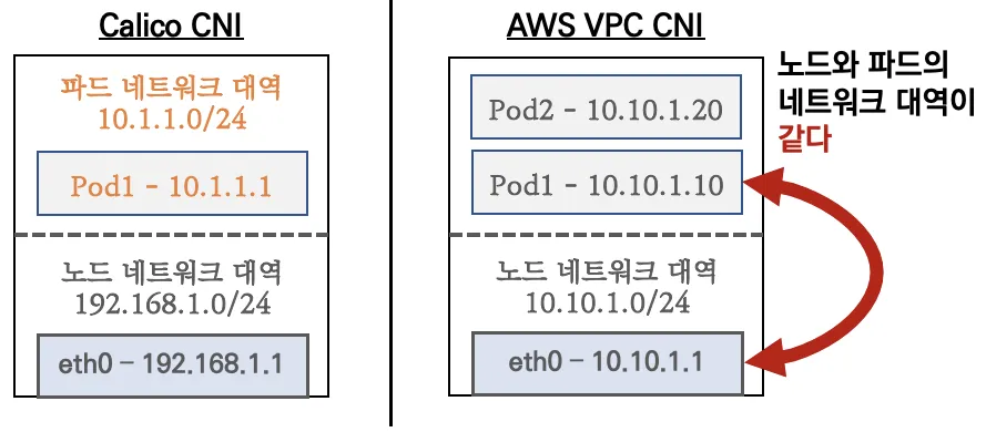 - 노드와 파드 대역 분리, 파드에 별도 서브넷 부여 후 사용