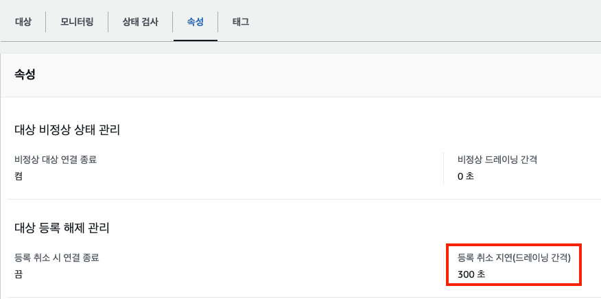 대상그룹의 '등록 취소 지연' 설정이 현재는 300초입니다.