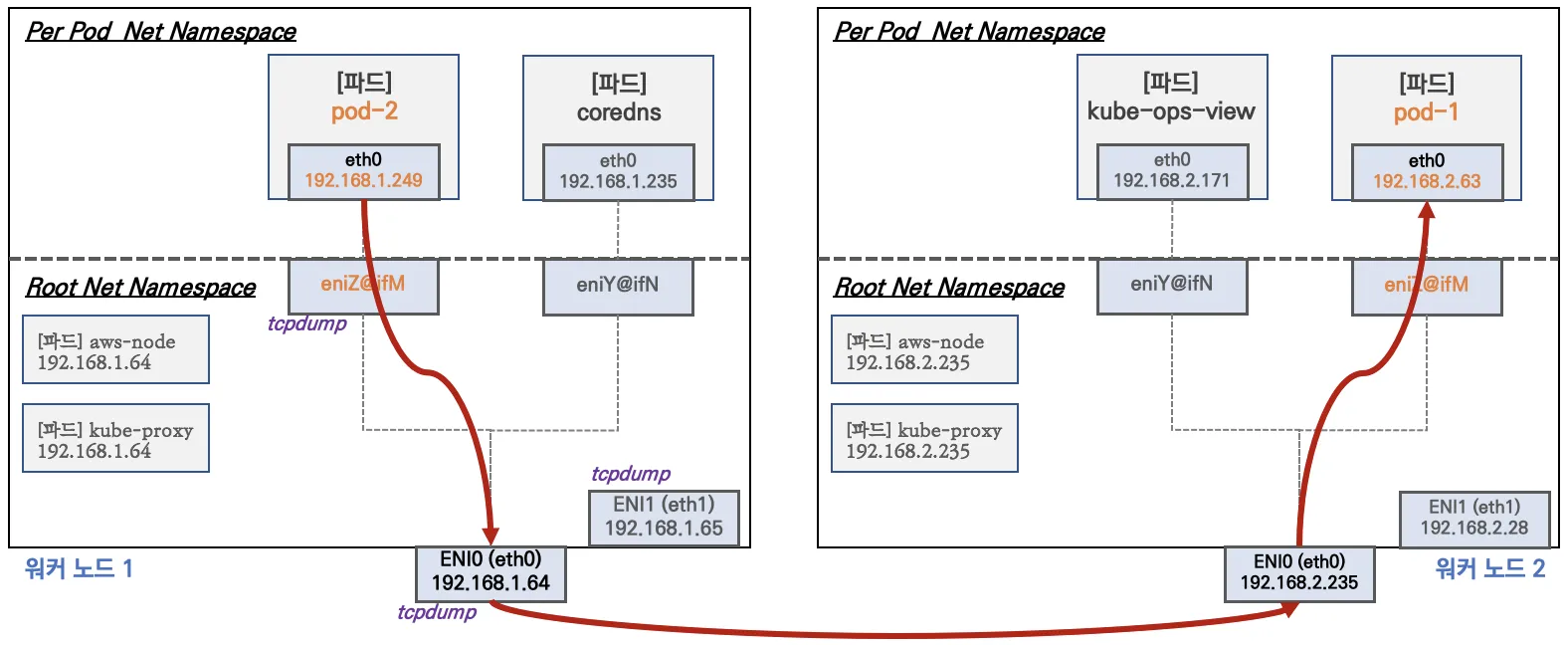 VPC CNI 의 가장 큰 특징은 Kubernetes Pod 가 노드와 동일한 네트워크 대역을 사용한다는 것입니다.