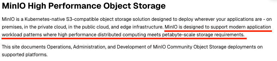 MinIO 의 공식문서에 나와 있는 것처럼 페타바이트 규모의 저장 요구사항을 만족하는 현대 애플리케이션 작업 패턴을 지원하도록 설계되기 위해서는 오브젝트 스토리지가 가장 적합했기 때문입니다.