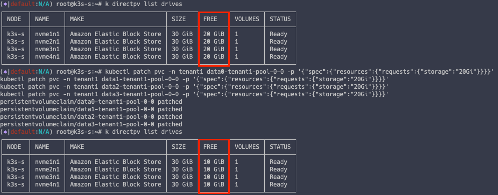 kubectl patch pvc -n tenant1 data0-tenant1-pool-0-0 -p '{"spec":{"resources":{"requests":{"storage":"20Gi"}}}}'