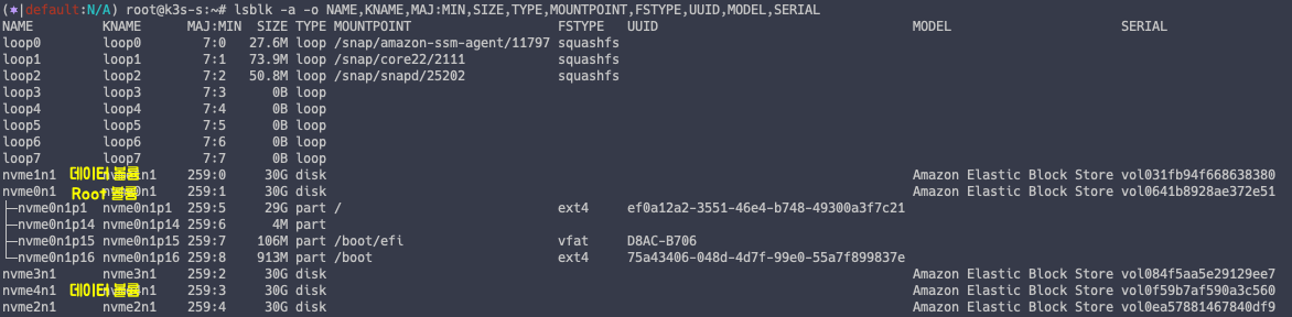 아래 명령어를 통해 EC2 에 연결된 EBS 5개의 정보를 확인할 수 있습니다.