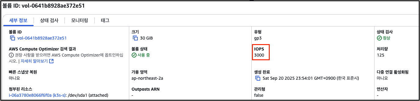 참고로 해당 IOPS 는 EBS gp3 배포 시에 적용된 IOPS 수치에 영향을 받습니다.