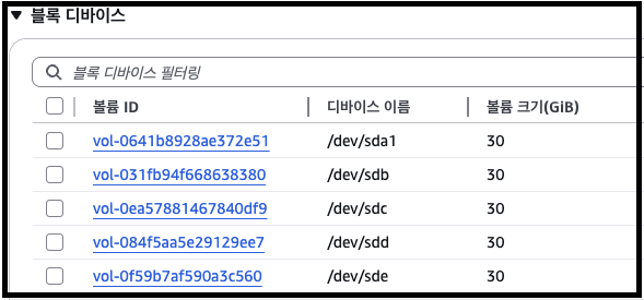 배포 하면 스토리지가 5개인 EC2 가 생성된 것을 확인할 수 있습니다.