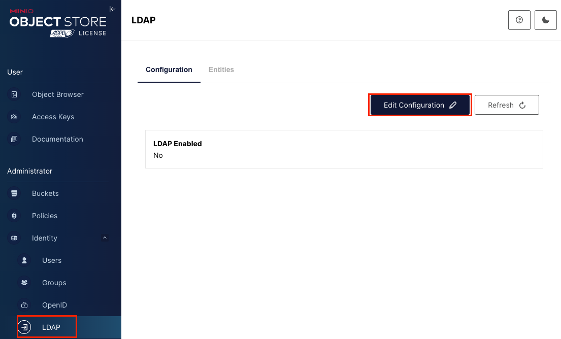 MinIO 는 사용자 ID 의 외부 관리를 위해 AD(Active Directory) 또는 LDAP 서비스 구성을 지원합니다.