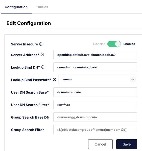 Lookup Bind DN* : `cn=admin,dc=**minio**,dc=io`