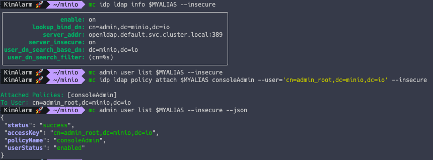 mc idp ldap policy attach $MYALIAS consoleAdmin --user='cn=admin_root,dc=minio,dc=io' --insecure
