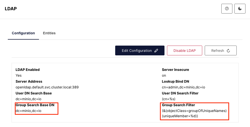 group_search_base_dn="dc=minio,dc=io" --insecure