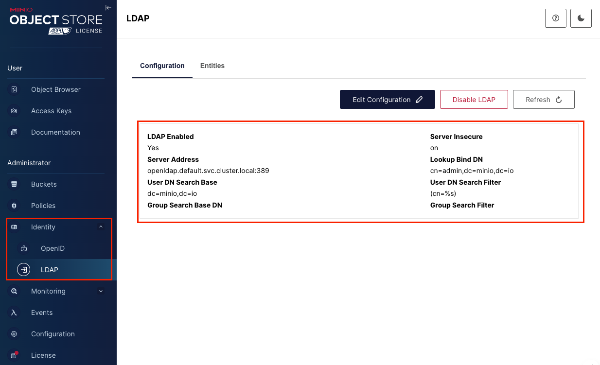 AD/LDAP 외부 ID 관리를 활성화하면 MinIO 내부 IDP 는 비활성화 됩니다.