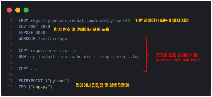 - from : 기반 이미지 (빌드에 사용될 Base Image)