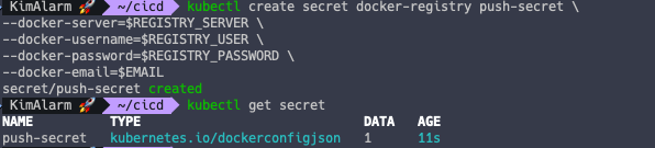 name: push-secret # 레지스트리에 인증하고 이미지를 푸시하는 데 사용할 시크릿 이름