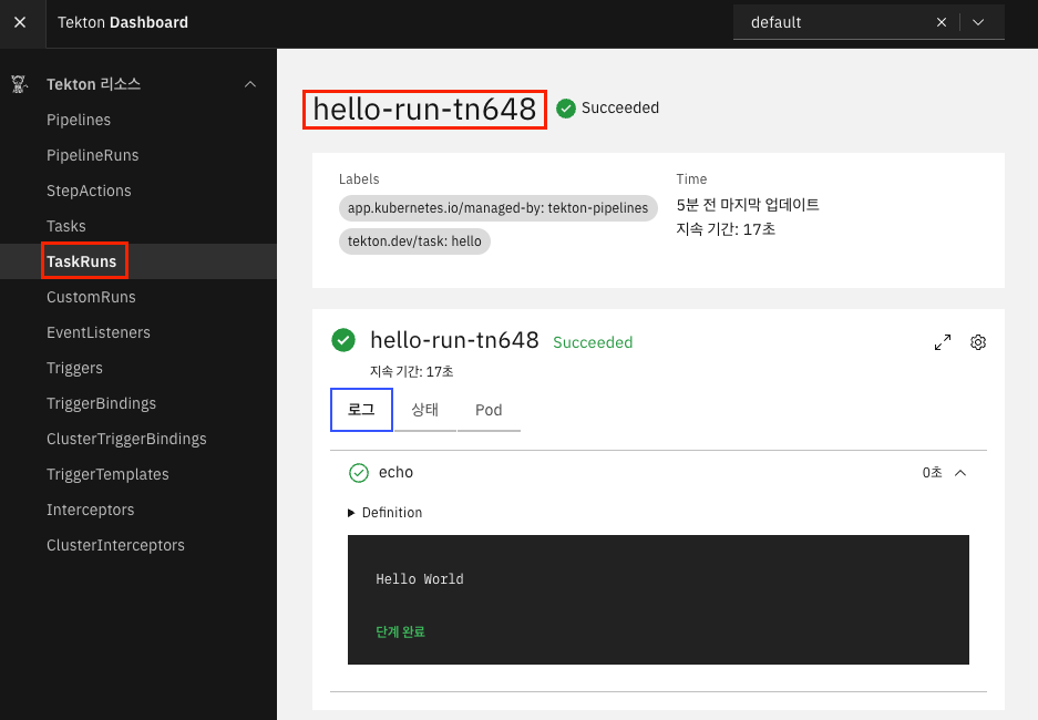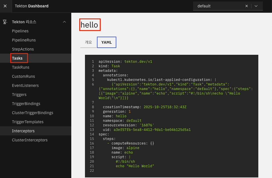 설치된 Tekton 을 사용하기 위해 간단한 Task 를 하나 만들어서 실행해보겠습니다.
