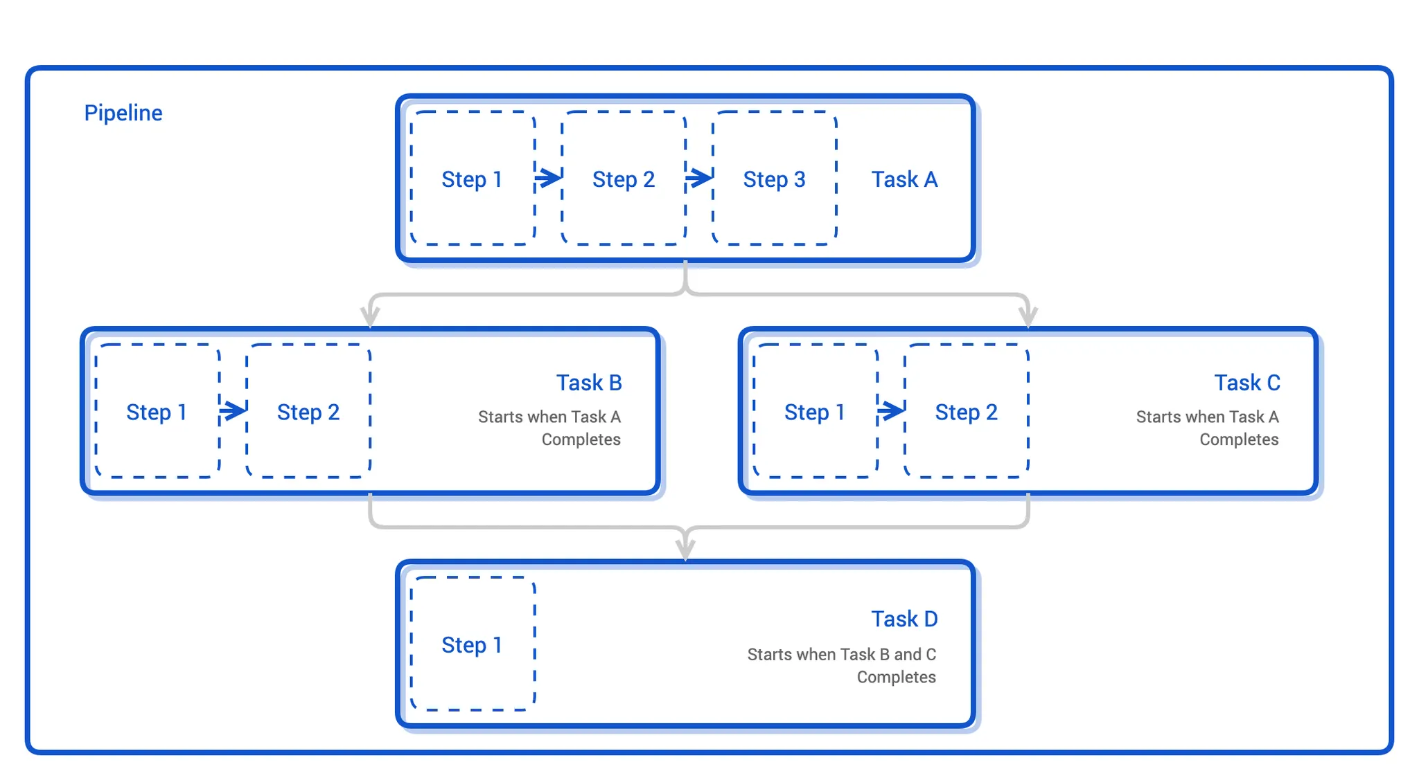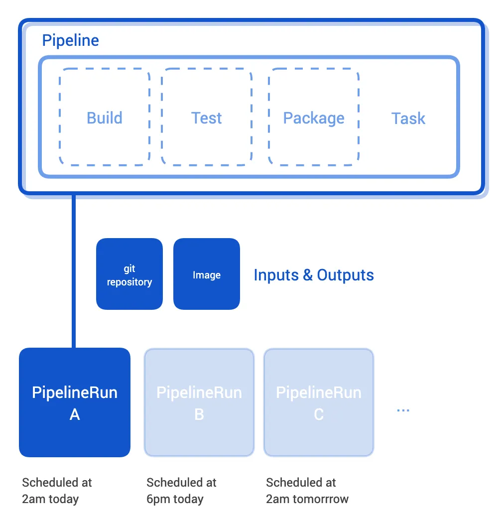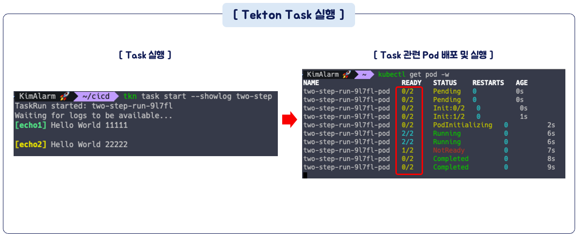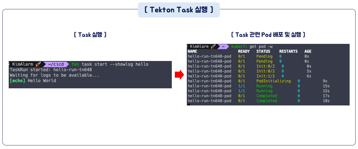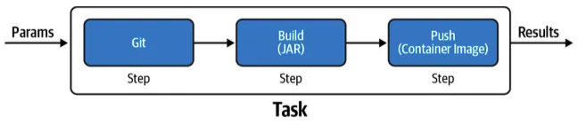파이프라인의 각 Task 는 Pod 로 실행되고 Task 안의 Step 은 Pod 안의 컨테이너로 수행됩니다.
