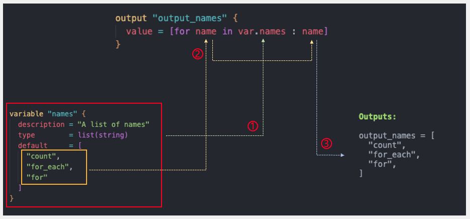 count, for_each 는 리소스와 인라인 블록을 반복했지만, for 반복문에서는 리소스 내의 값을 반복할 수 있다.