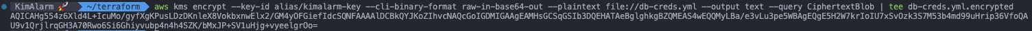 aws kms encrypt --key-id alias/{KMS-ALIAS} --cli-binary-format raw-in-base64-out --plaintext file://db-creds.yml --output text --query CiphertextBlob | tee db-creds.yml.encrypted
