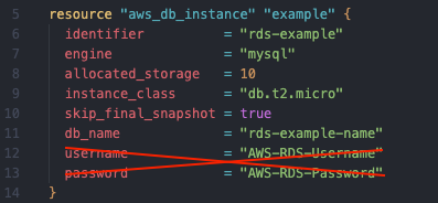 RDS 리소스를 생성할 때 다음과 같이 코드를 작성할 수 있습니다.