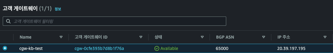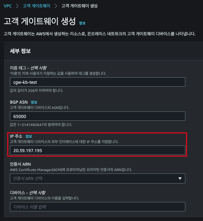 해당 IP 를 이용해서 AWS Customer Gateway 를 생성할 것이다.
