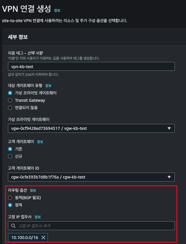 또한, 정적 라우팅을 사용할 예정이므로 고정 IP 접두사에 Azure 의 vNet 범위를 입력한다.
