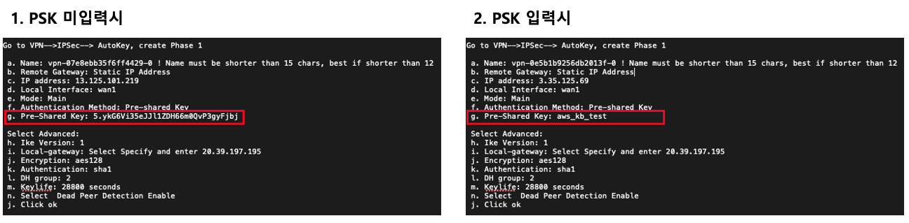 터널 2개의 Pre-Shared Key (사전 공유 키) 를 직접 입력해주어도 되지만,