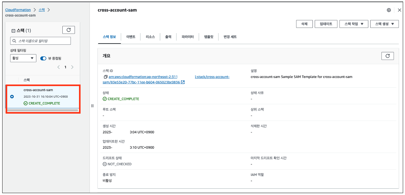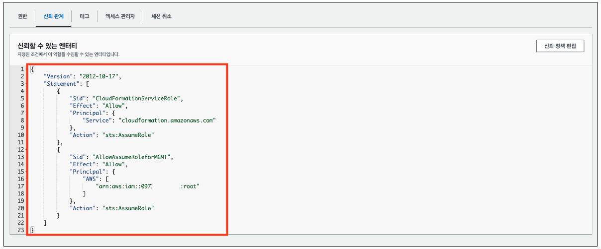 - 실제 AWS 리소스가 배포될 계정의 권한을 위임받아 CloudFormation 을 실행합니다.