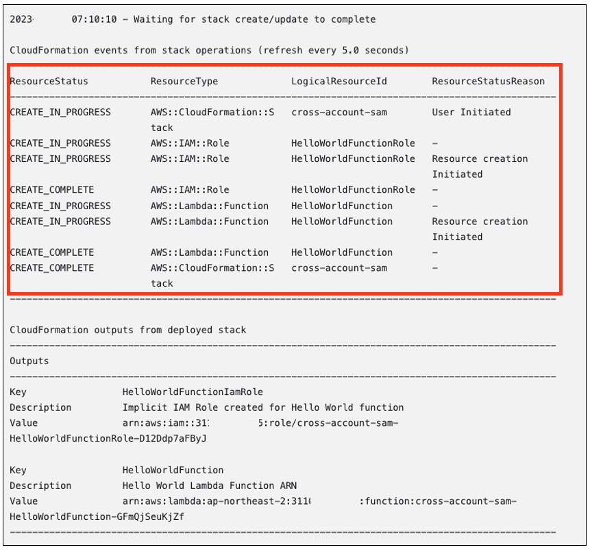 - AWS SAM Template 에 지정된 리소스가 배포됩니다.