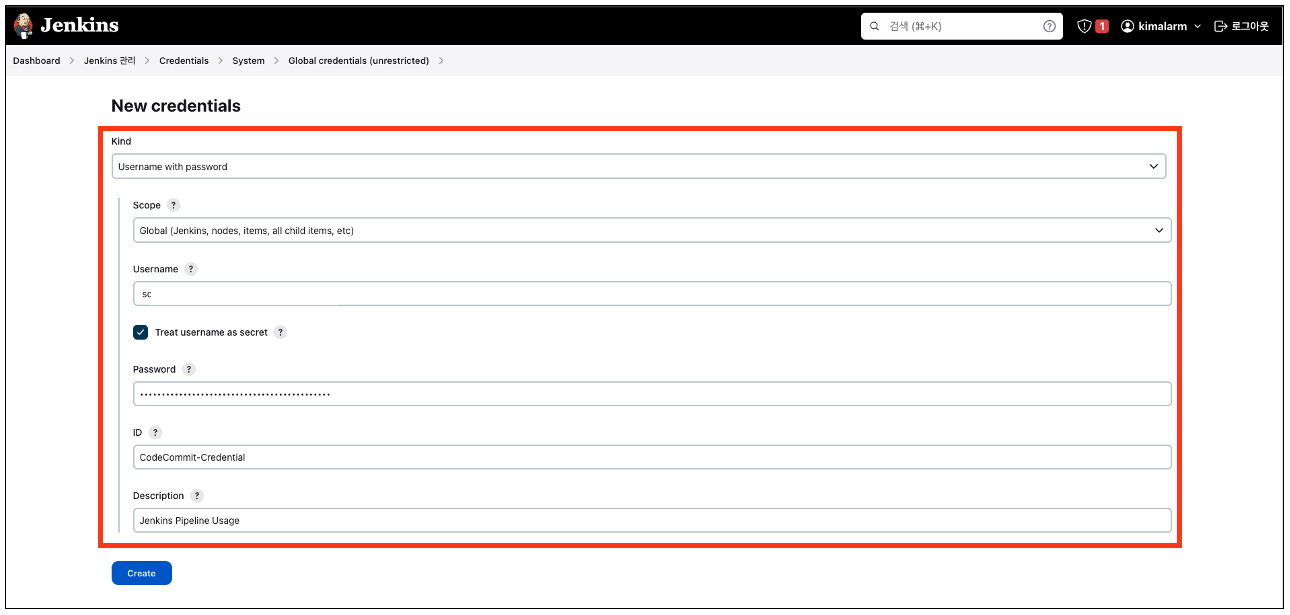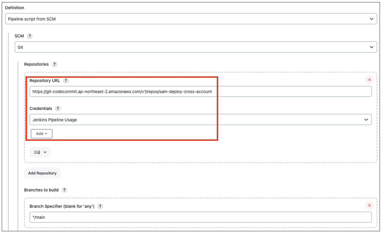 연동할 CodeCommit 의 URL 입력 후, 앞서 기입했던 Jenkins Credential 을 선택합니다.