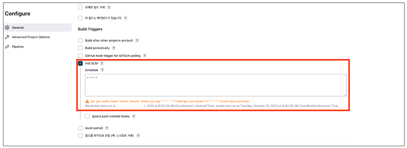 특정 플러그인을 통해 Trigger 설정이 가능하나, 여기서는 Polling 방식으로 사용하겠습니다.