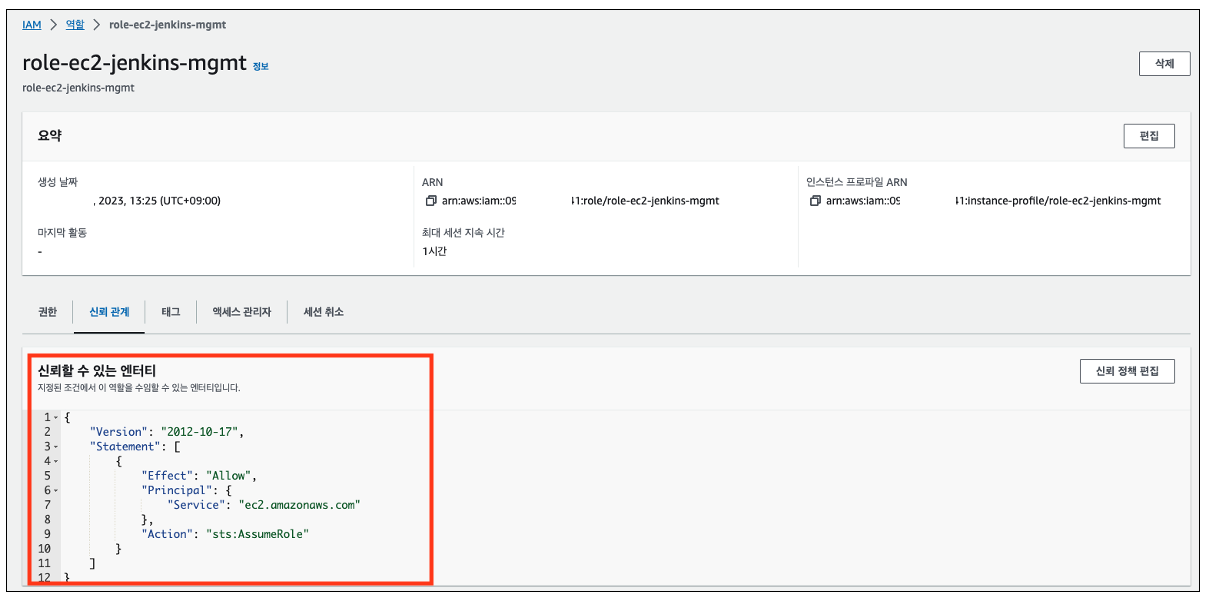 Jenkins 에서 해당 IAM Role 을 사용할 수 있도록 신뢰 관계 정책을 부여해줍니다.
