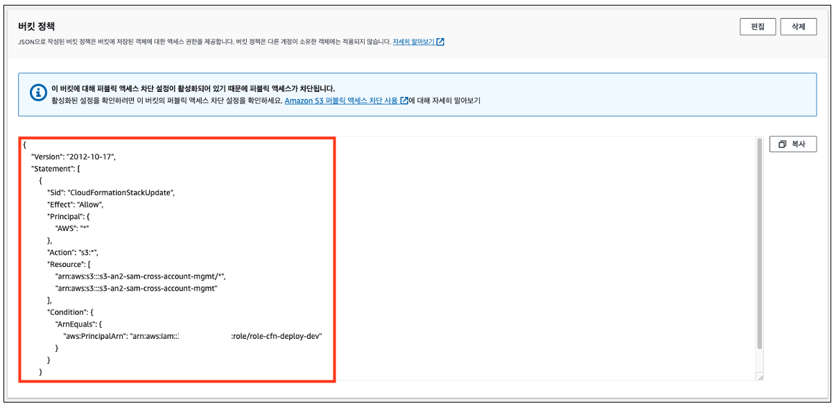 DEV CloudFormation 실행 역할이 버킷에 접근할 수 있도록 다음과 같은 정책을 넣어줍니다.