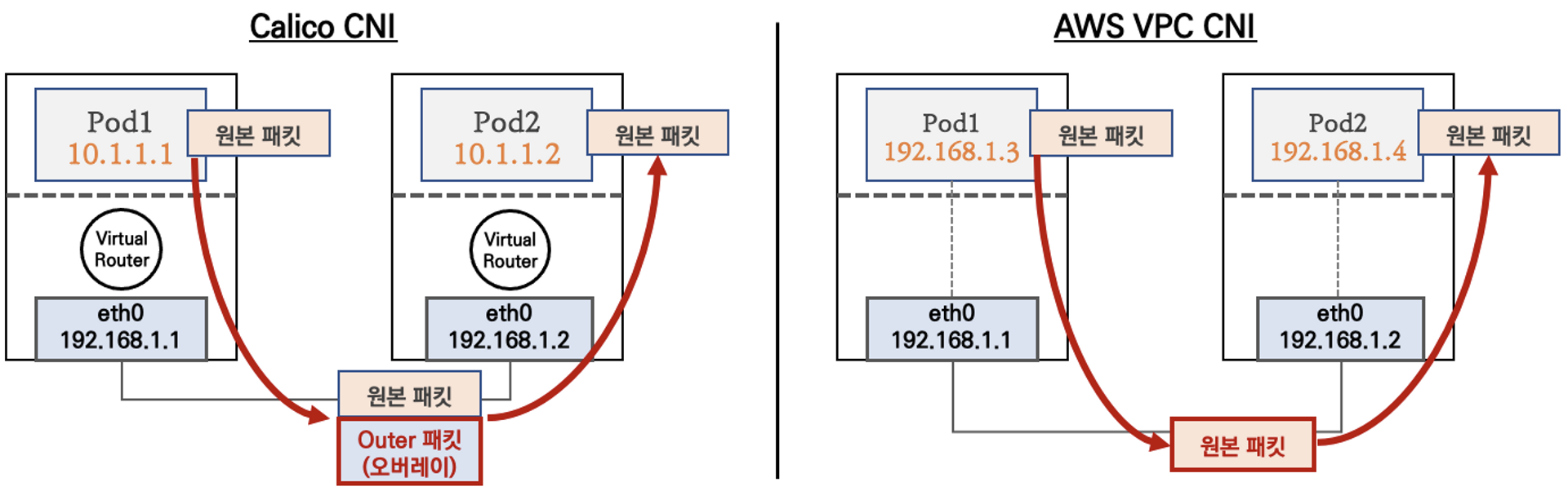 이미지에서 볼 수 있는 것처럼 Calico CNI 는 가상의 라우터를 한 번 더 거치기 때문에,
