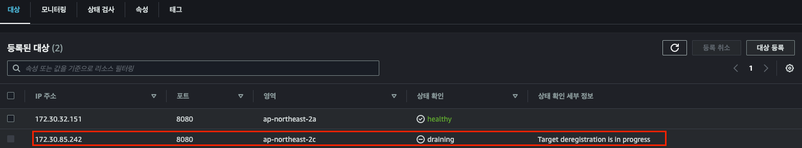 - Pod 의 개수가 변경될 때 LB와 함께 배포되어 있는 대상 그룹의 설정은 어떻게 변할 지 확인해봅시다.