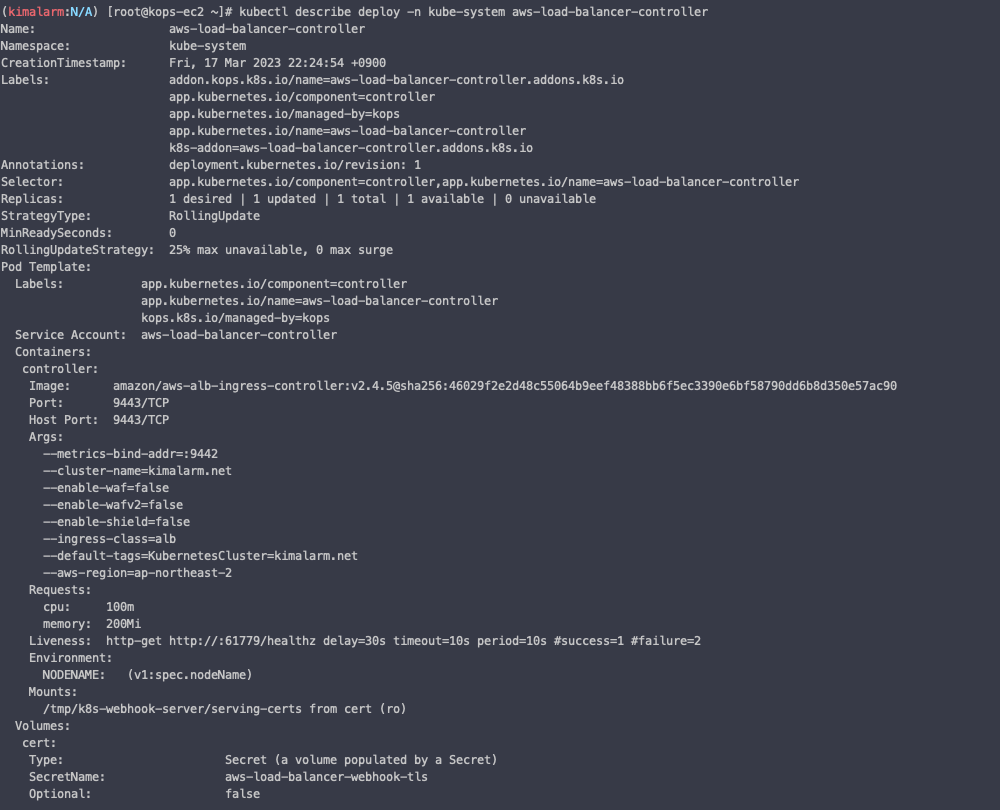 현재 클러스터 환경은 kops 로 구성되어 있기 때문에, 아래 명령어를 통해 kops 에 LB Controller 를 구성해줍니다.