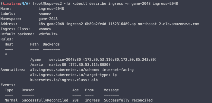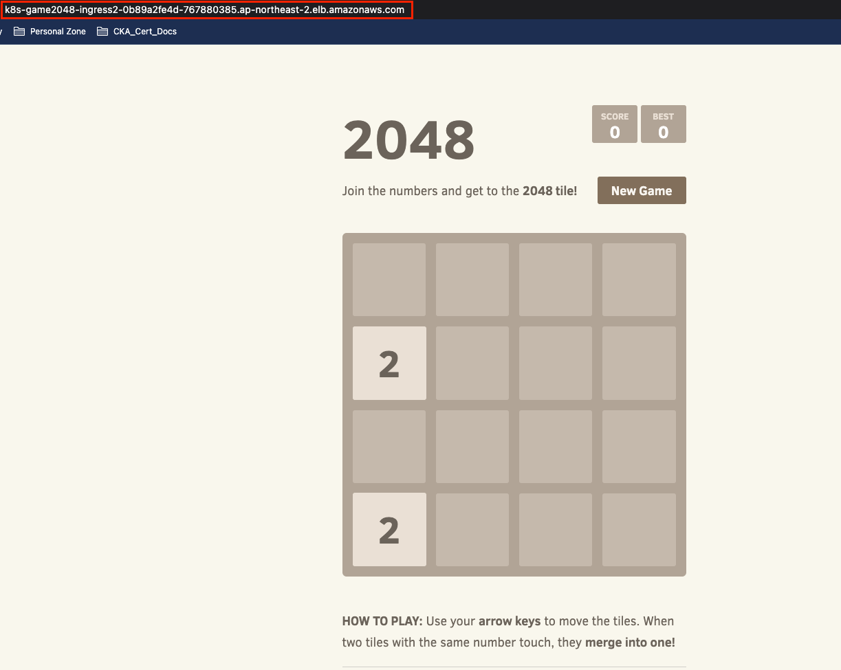 2048 게임을 실행시키는 2개의 pod 를 가진 deployment 를 생성하고, 서비스를 생성한 뒤 Ingress 를 통해 / Path 로 진입 시 2048 게임으로 이동하도록 설정해둔 yaml 파일입니다.