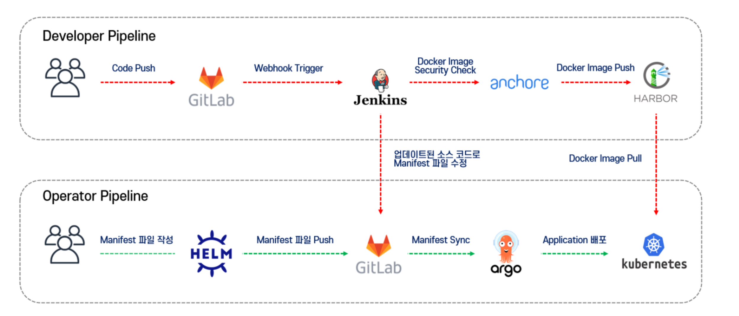 예전에 구축했던 GitOps 아키텍처인데, 현재 Anchore는 Harbor 의 Trivy 로 대체하였습니다.