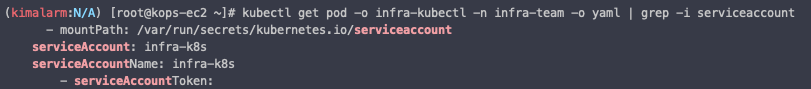 kubectl get pod -o infra-kubectl -n infra-team -o yaml | grep -i serviceaccount