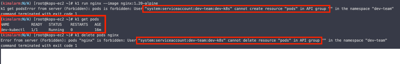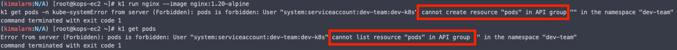 해당 Service Account 가 Pod 를 조회하고 생성할 수 있는 권한이 없는 것을 알 수 있다.
