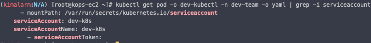kubectl get pod -o dev-kubectl -n dev-team -o yaml | grep -i serviceaccount