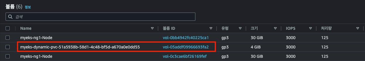 AWS 볼륨 콘솔에서 확인해보면 Snapshot 을 이용하여 PV에 사용할 EBS 를 생성한 후 EKS Node 에 Attach 된 것을 알 수 있습니다.