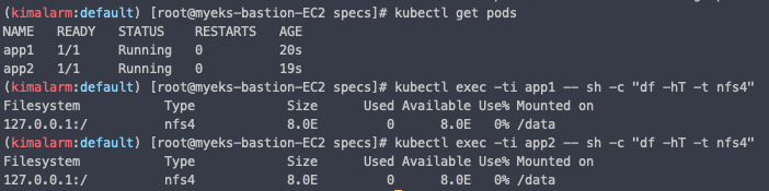 kubectl exec -ti app1 -- sh -c "df -hT -t nfs4"