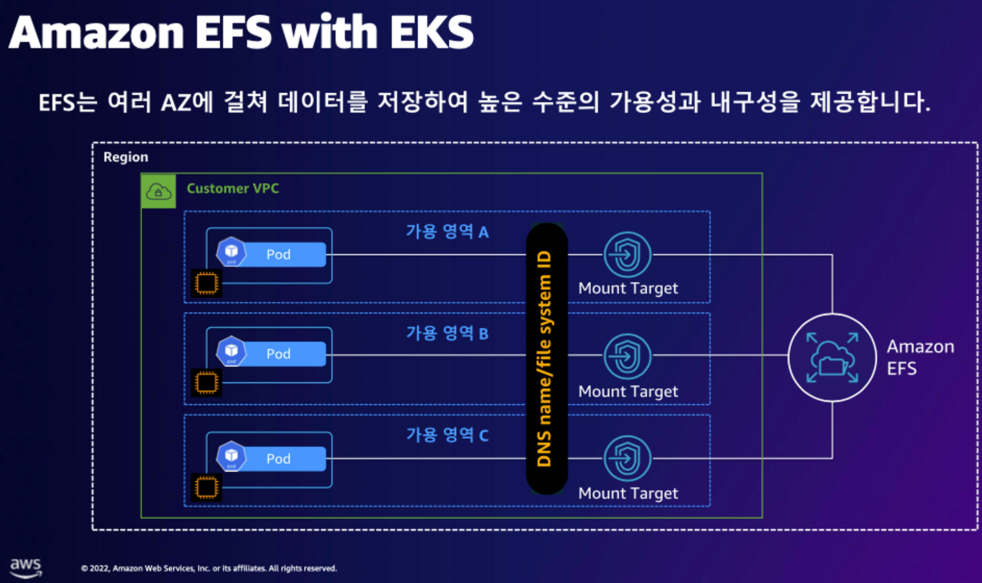 Cross-AZ 가 가능한 공유 스토리지이기 때문에 여러 가용영역의 Pod 가 동일한 데이터를 사용해야 한다면 고려할 수 있는 서비스입니다.