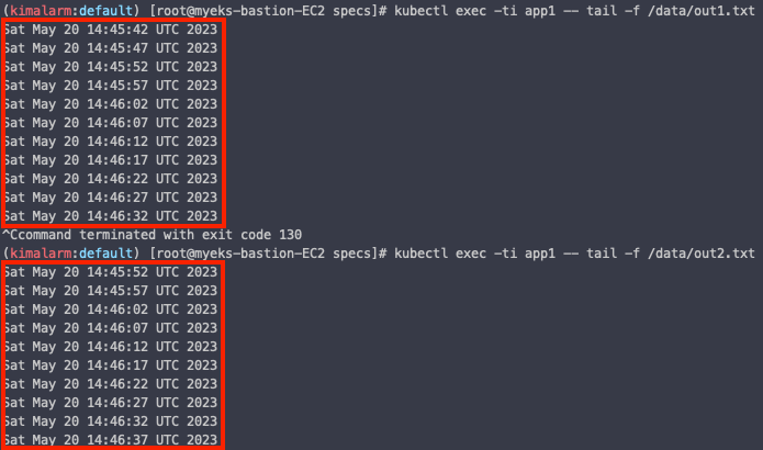 kubectl exec -ti app1 -- tail -f /data/out1.txt