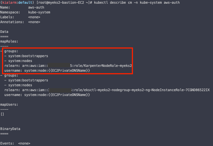 Karpenter 가 리소스를 사용하기 위한 auth 또한 적용이 되어 있습니다.