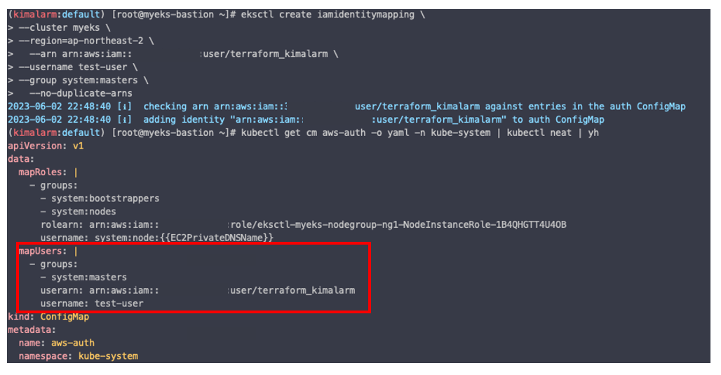명령어가 정상적으로 수행되었다면 aws-auth 에서 확인할 수 있습니다.