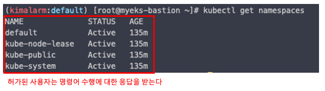 EKS 사용자가 kubectl 명령어를 수행했을 때, 앞서 설명했던 kubeconfig 파일의 설정을 바라보게 됩니다.